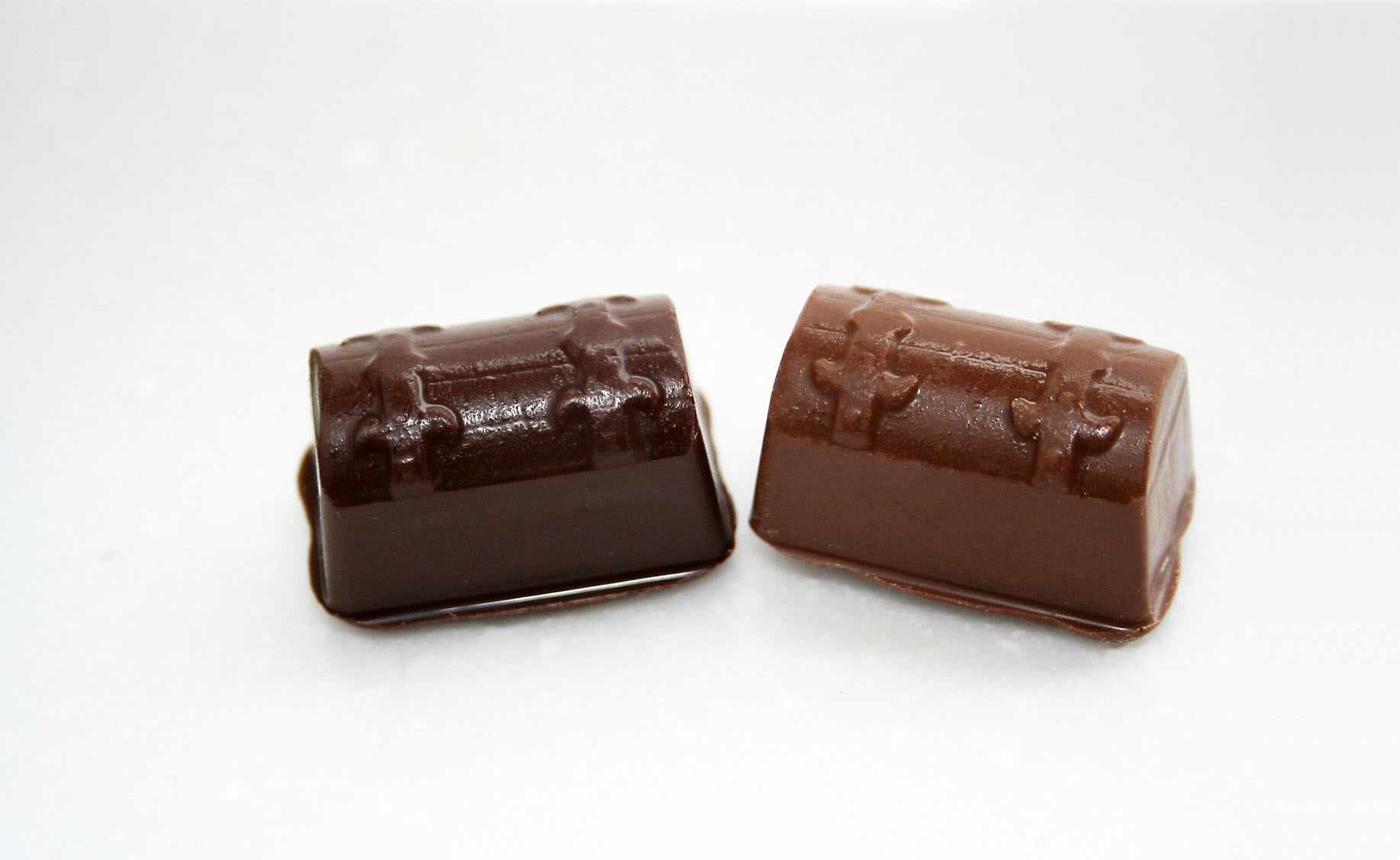 Chocolate treasure chests filled with vanilla caramel and roasted salted almonds.