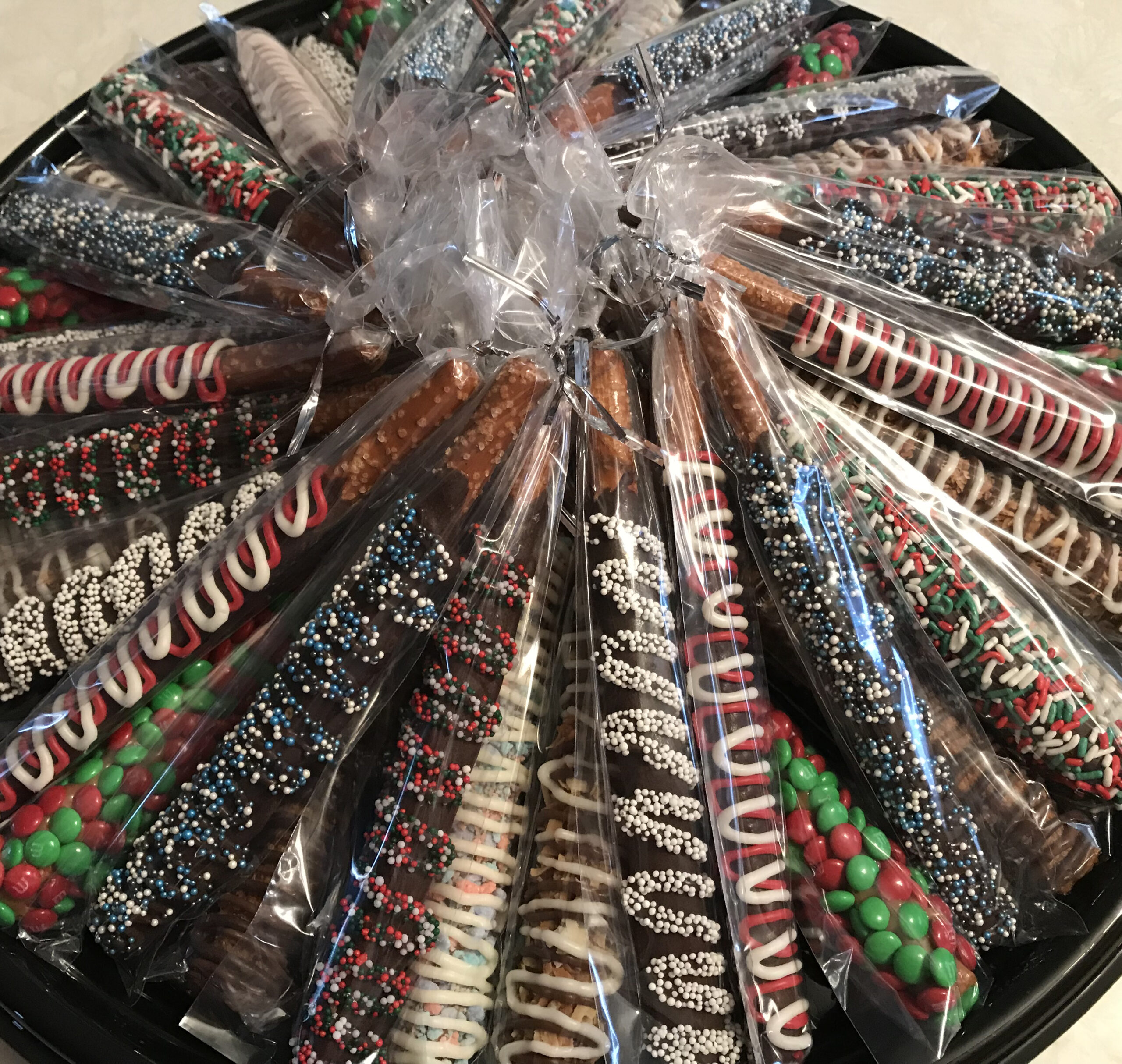 Decorated for any occasion, enjoy these caramel dipped, chocolate-coated pretzels with many topping options!