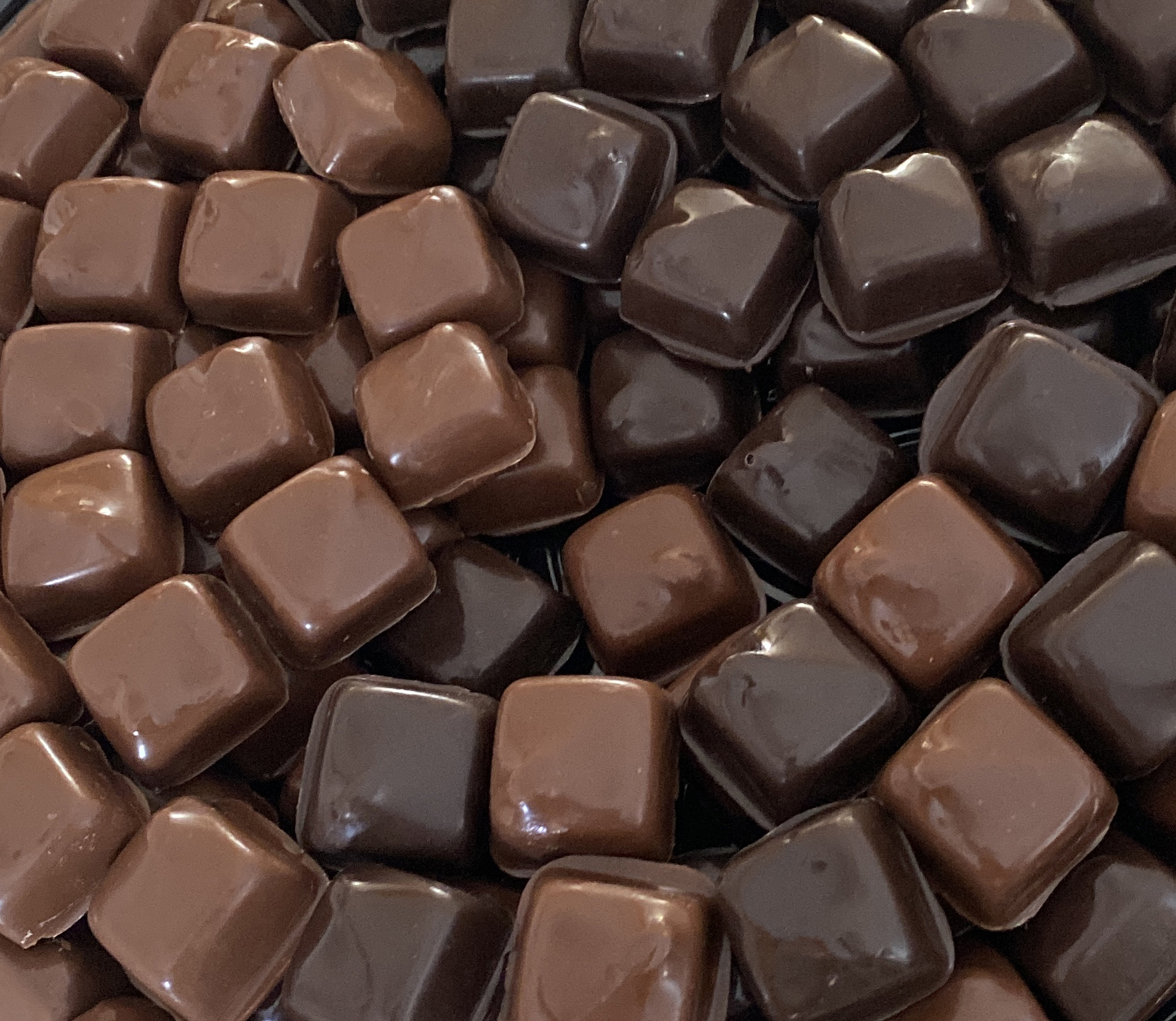 Chewy melt in your mouth vanilla caramels covered in milk or dark chocolate.